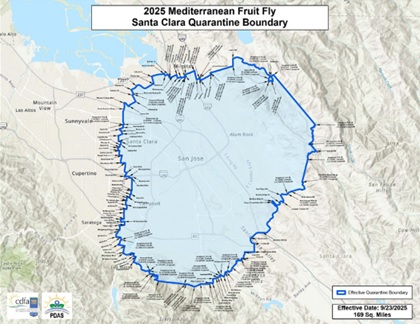 El CDFA de California, en cooperación con el USDA y los Comisionados Agrícolas del Condado de Santa Clara, amplían la cuarentena para la mosca mediterránea de la fruta (Ceratitis capitata). La ampliación abarca la ciudad de San José y cambia de 118 a 169 millas cuadradas.