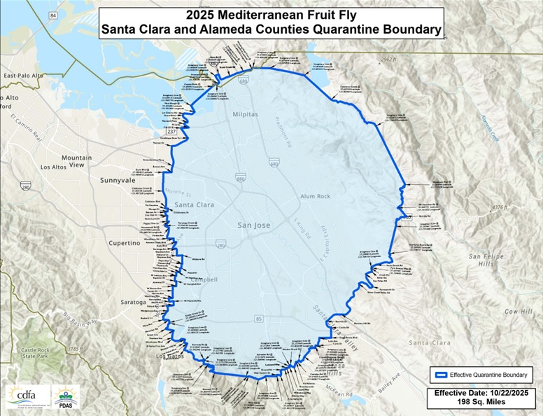 El CDFA de California, en cooperación con el USDA y los Comisionados Agrícolas del Condado de Santa Clara, amplían la cuarentena para la mosca mediterránea de la fruta (Ceratitis capitata). La ampliación abarca zonas del condado de Santa Clara, así como del condado de Alameda, recientemente se había agregado una milla mas y con fecha del 22 de octubre de 2025 se agrega otra milla llegando a 198 millas cuadradas.