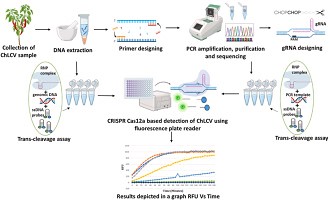 Se utilizó CRISPR/Cas12a para la detección rápida y eficiente de Chilli Leaf Curl Virus (ChLCV). Este método fue capaz de detectar ADN genómico de ChLCV a una concentración de 1 ng sin necesidad de amplificación previa con cebadores específicos de los genes AV1 y AC1. El enfoque demuestra la novedosa utilidad de CRISPR/Cas12a para la detección directa e in situ de ChLCV sin necesidad de amplificación térmica o isotérmica en el laboratorio.