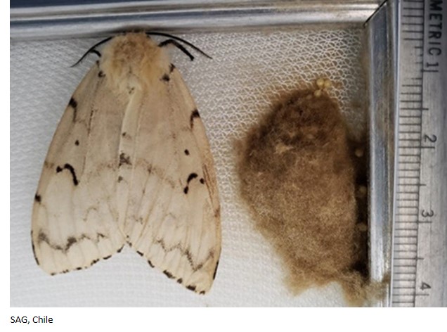 Durante una inspección rutinaria del Programa de Control de Frontera, especialistas del SAG detectaron masas de huevos de la palomilla esponjosa, Lymantria dispar, en el buque BBC Elizabeth, procedente de Corea del Sur. L. dispar es una de las plagas defoliadoras más destructivas del mundo y ataca tanto especies forestales como frutales.