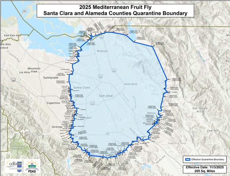 El CDFA de California, en cooperación con el USDA y los Comisionados Agrícolas del Condado de Santa Clara, amplían la cuarentena para la mosca mediterránea de la fruta (Ceratitis capitata). La ampliación comprende áreas del condado de Santa Clara, asi como del condado de Alameda y cambia de 198 a 205 millas cuadradas.