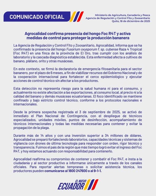 La Agencia de Regulación y Control Fito y Zoosanitario (AGROCALIDAD) de Ecuador ha confirmado la presencia de Foc R4T en una finca de la Provincia de El Oro, en el Cantón Santa Rosa, y ha firmado la declaratoria de emergencia fitosanitaria para el sector bananero por un plazo de seis meses para fortalecer el cerco epidemiológico y ejecutar acciones de control técnico. El foco se mantiene confinado y bajo estricto control técnico de acuerdo a los protocolos nacionales e internacionales.