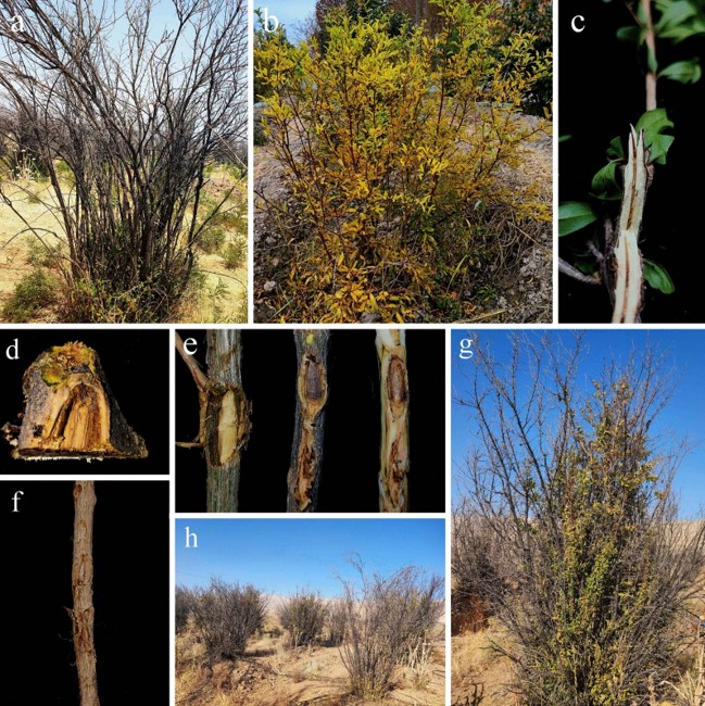 Se observaron síntomas de cancro y decoloración de madera en el tronco y ramas de plantas de granado. Mediante el análisis de PCR anidada se detectó al hongo Stilbocrea banihashemiana en las muestras sintomáticas, también se detectaron infecciones latentes en el 10% de las muestras asintomáticas indicando una fase latente del patógeno. Este estudio representa el primer reporte mundial de S. banihashemiana asociada con cancro y muerte regresiva en granado.