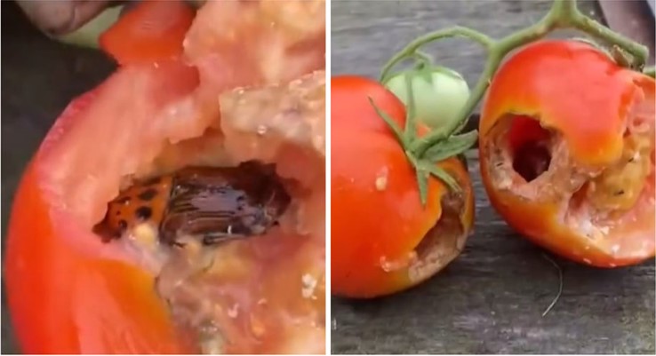 Una empresa dedicada al riego y a la lucha contra el avance del picudo rojo ha publicado un video en el que se observa a un picudo rojo adulto dentro de un tomate, fruto al que devoró parcialmente desde el interior. Aclaran que dicha plaga puede presentar un comportamiento oportunista de alimentación y que esto no convierte al tomate en planta hospedante.