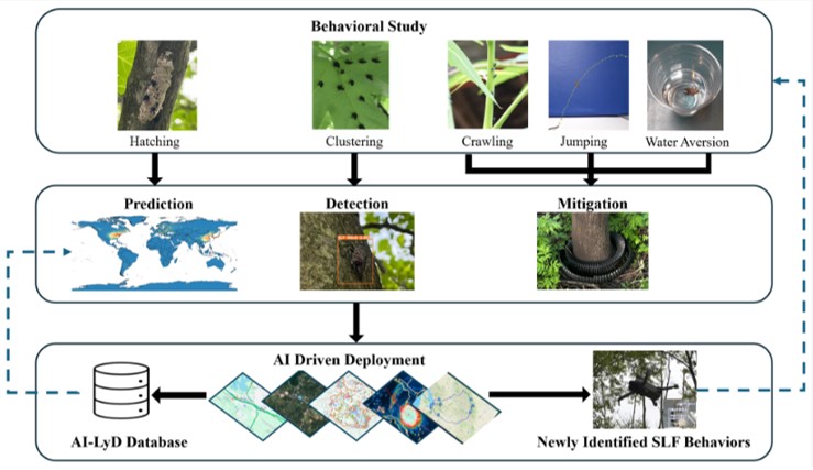 En este artículo se presenta "AI-LyD", un marco de manejo integrado de plagas (MIP) que integra el comportamiento del insecto, la inteligencia artificial y medidas de control físicas de bajo costo, para gestionar las poblaciones de la mosca linterna manchada (Lycorma delicatula). AI-LyD se probó en cuatro localidades del condado de Hunterdon, Nueva Jersey, logrando una reducción poblacional de L. delicatula del 91%.