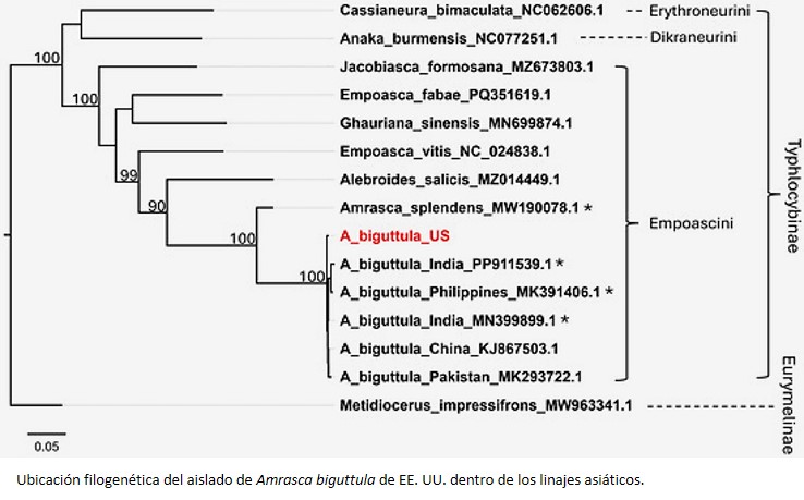 Se informa sobre la primera evidencia confirmada mediante código de barras de ADN de la presencia en los Estados Unidos de A. biguttula (Hemiptera: Cicadellidae). La confirmación molecular estuvo basada en muestras formadas por ninfas de múltiples estadios y ejemplares adultos de un campo de algodón, en Macon, Alabama.